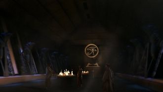 This place is a huge underground chamber. It is lit by two big braziers. There are two lines of massive statues representing people with animal's head. On the background is the symbol of Ra. On the walls are written many symbols (SG1: "Children of the Gods").