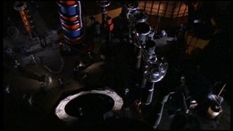SG-1 arrives to P3R-233 in a big and dark room. They start to explore the location using their flashlights. Daniel Jackson is recording a videotape and goes to another room with Captain Samantha Carter. Teal'c notices some damage made by Goa'uld weaponry. A battle took place long ago. Colonel Jack O'Neill sees a big dark symbol erected here. When Teal'c turns his eyes on it, he looks concerned and warns that they must return as soon as possible on Earth because this planet has been wiped out and left contaminated. The planet's surface is radioactive.